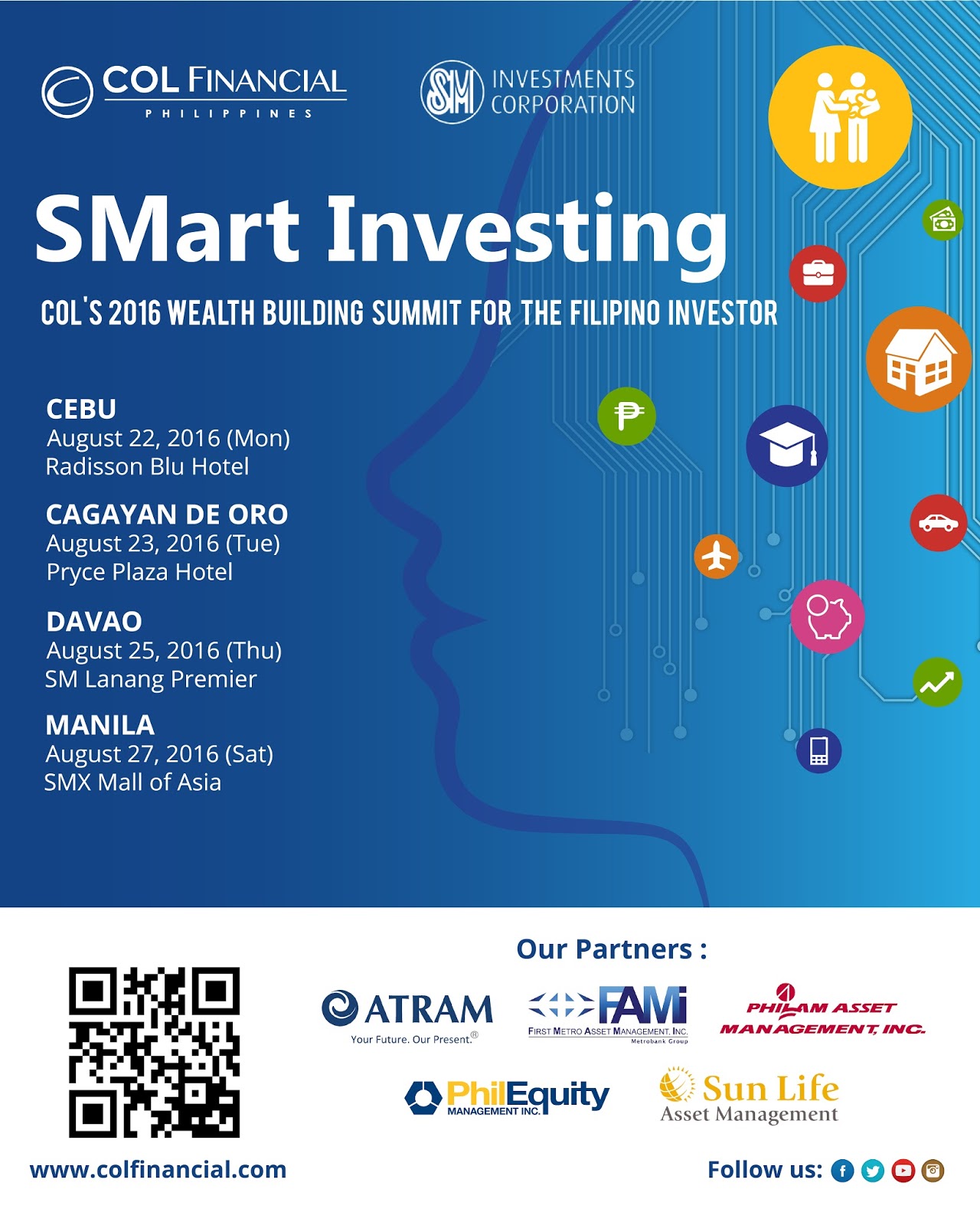 SMart Investing will kickstart this journey towards financial literacy on August 22 in Cebu, at the Radisson Blu Hotel from 8:30 am to 5:00 pm. The summit continues on August 23 at Cagayan de Oro for a 12:00 pm afternoon session at the Pryce Plaza Hotel. The last two days of the summit will be in Davao on August 25 at SM Lanang Premier, and in Manila on August 27 at SMX Mall of Asia, from 8:30am to 5:00pm on both days.