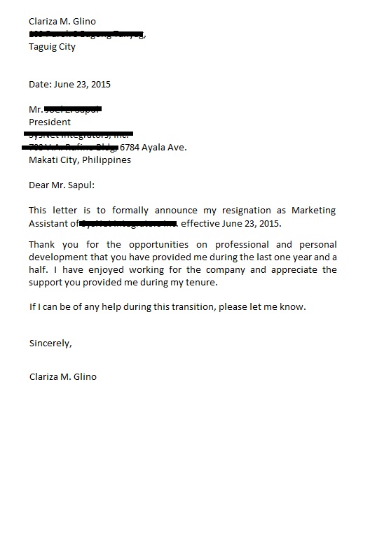 Now that you’ve had a talk with your boss and firm with your decision, you can now create your resignation letter without feeling burdened. The Resignation Letter is an important document that you send to formalize your decision. Here’s a sample of resignation letter. This is actually a resignation I created before when I transferred from SysNet to WiFun. The letter maybe too much so you have the option to narrow it down. Again, the internet has a lot of templates available for a resignation letter.